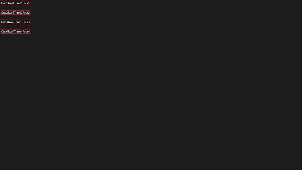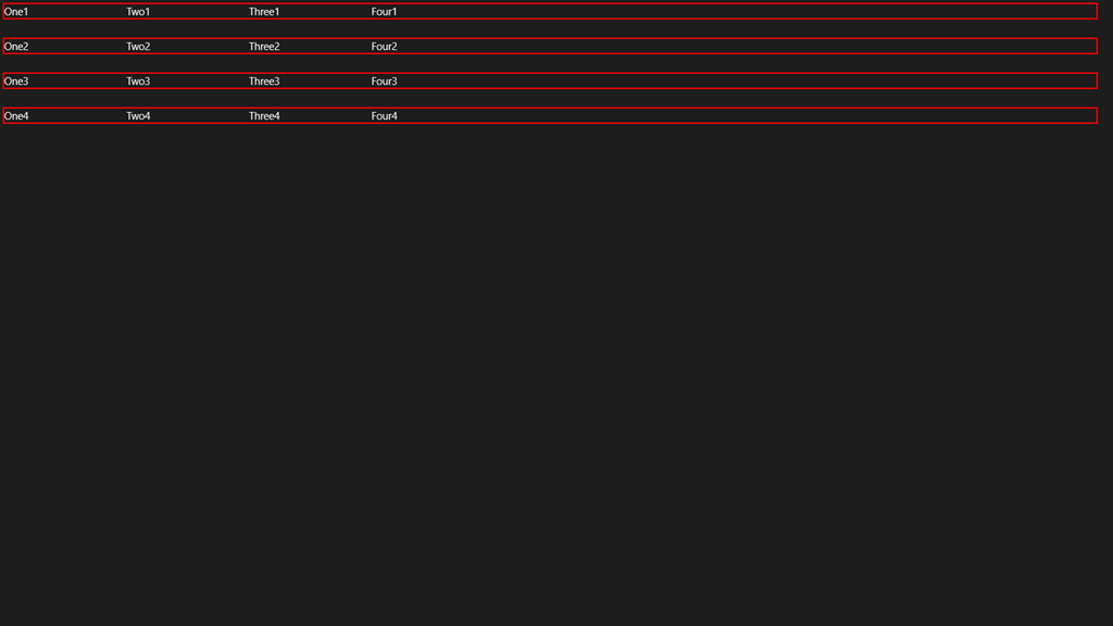 <ListView Name="ListView1"> <ListView.ItemTemplate> <DataTemplate> <Border BorderBrush="Red" BorderThickness="2"> <Grid> <Grid.ColumnDefinitions> <ColumnDefinition Width="1*"/> <ColumnDefinition Width="1*"/> <ColumnDefinition Width="1*"/> <ColumnDefinition Width="6*"/> </Grid.ColumnDefinitions> <TextBlock Grid.Column="0" Text="{Binding One}"/> <TextBlock Grid.Column="1" Text="{Binding Two}"/> <TextBlock Grid.Column="2" Text="{Binding Three}"/> <TextBlock Grid.Column="3" Text="{Binding Four}"/> </Grid> </Border> </DataTemplate> </ListView.ItemTemplate> </ListView>